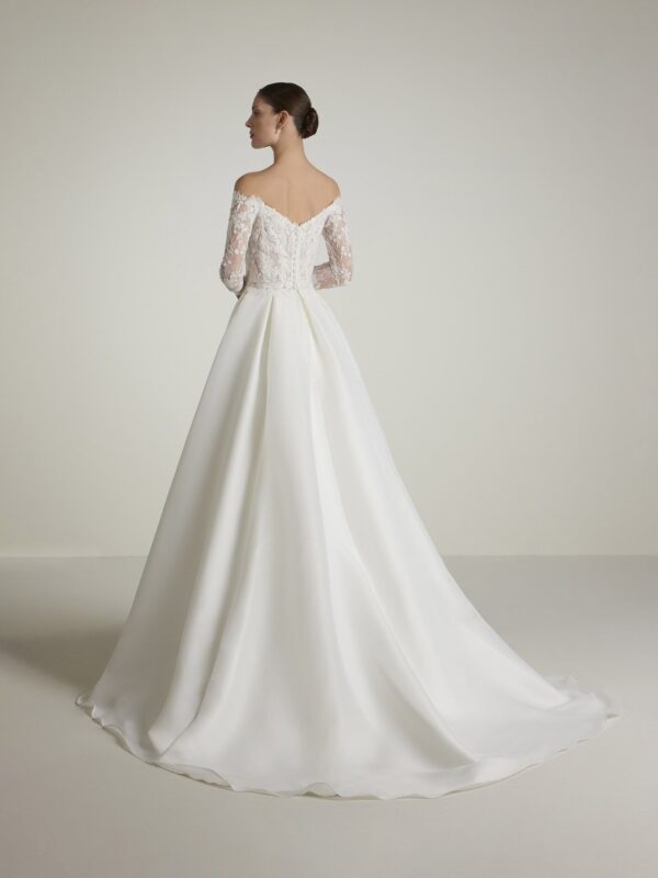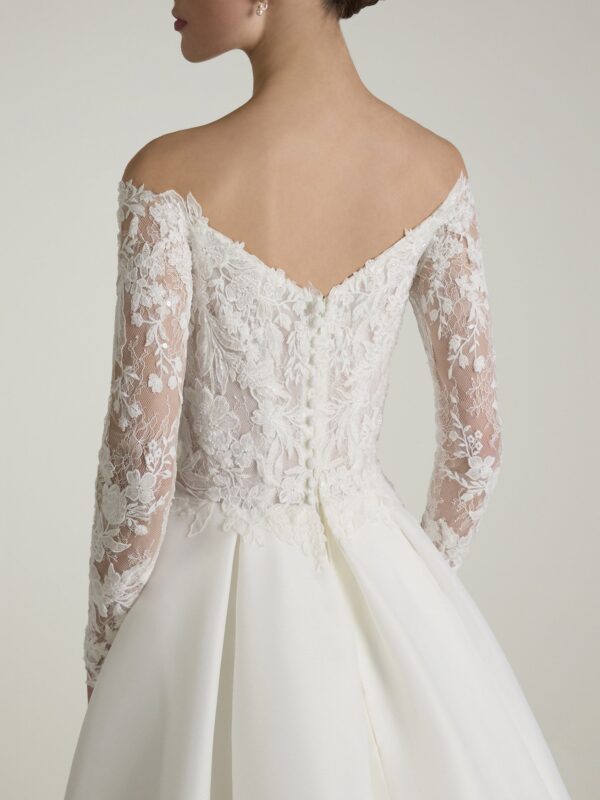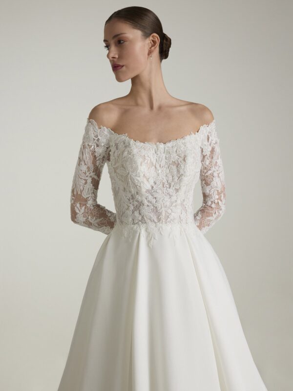 Den vackra off-shoulder-urringningen ramar in axlarna på ett mjukt sätt. De långa spetsärmarna ger en tidlös och exklusiv känsla.