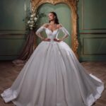 Kjolen är voluminös och svepande, vilket ger en dramatisk effekt. Därför passar FS-2605 perfekt för storslagna bröllop i slott, herrgårdar eller lyxiga salonger. Tyget i kjolen är elegant strukturerat med diskreta broderier som fortsätter hela vägen ner i det imponerande släpet. Klänningen är både romantisk och praktfull – en kombination som fångar allas blickar.