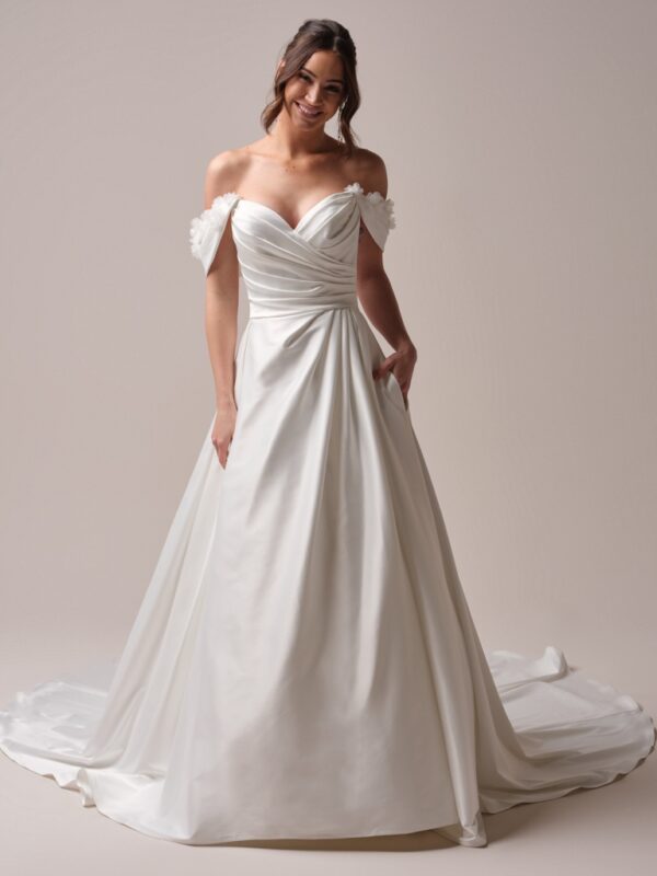 Hannah är en bröllopsklänning som fångar hjärtat direkt. Med en off shoulder-ringning och mjuka draperingar ger den ett romantiskt och tidlöst intryck. Klänningens livstycke har figursydd design som framhäver midjan och skapar en vacker siluett. De lätta axelbanden vilar elegant på överarmarna och förstärker det feminina uttrycket.