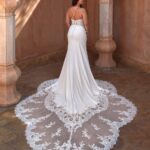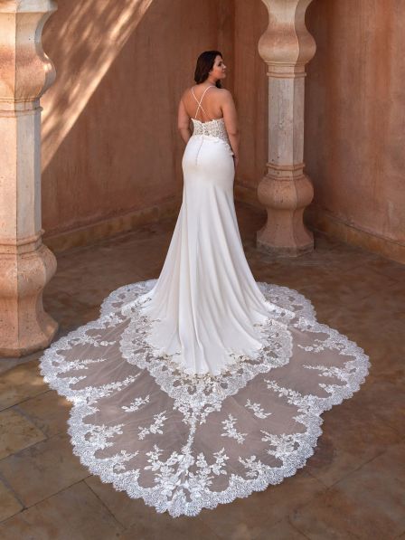 - En klänning i sirenstil med korsade ryggband och ett sensuellt passande liv med utsökta blommiga spetsdetaljer.