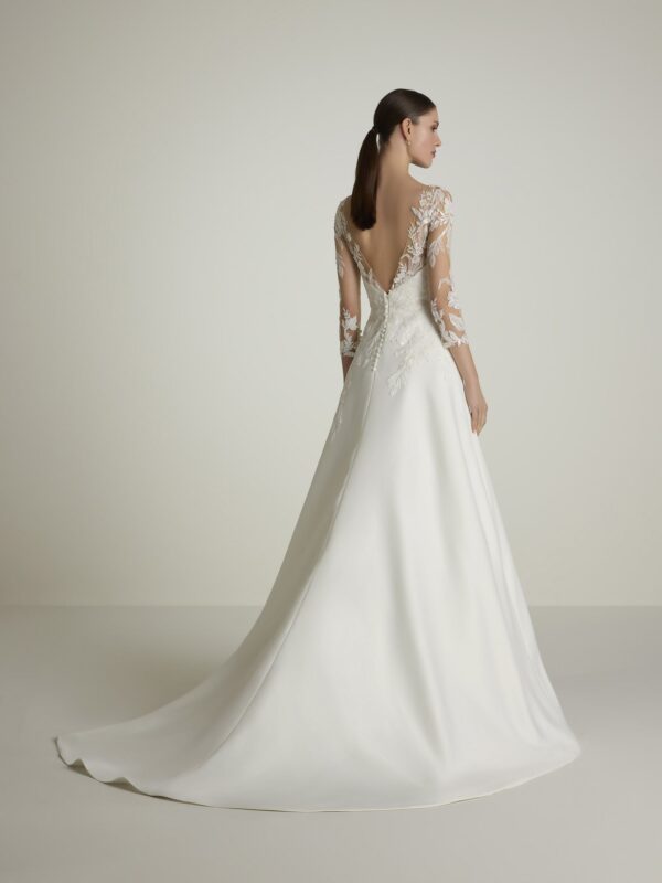 RIVERES är en sofistikerad och romantisk brudklänning som utstrålar tidlös elegans. Klänningen har en klassisk A-linjeform med en elegant kjol i slät mikado som faller vackert från midjan och ger en majestätisk siluett. Livet är rikt dekorerat med delikata spetsapplikationer som fortsätter upp mot en transparent illusionstopp. Den djupt skurna sweetheart-urringningen kombineras med en illusion-halsringning och trekvartslånga ärmar i transparent tyll, prydda med broderade spetsdetaljer i floralt mönster som ger klänningen en känsla av lätthet och romantik.
